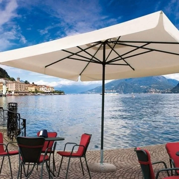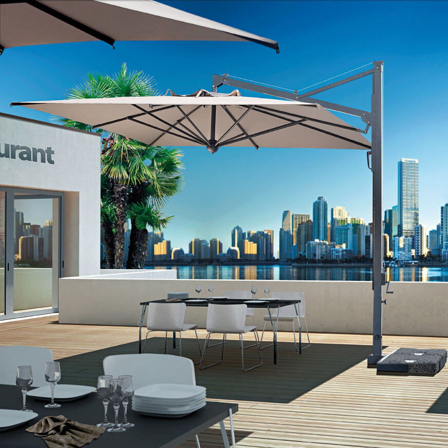A simple yet elegant solution for hotels, beaches, and terraces. The Standard Rimini sunshade is available in a 3 × 3 m size with a sturdy metal frame. Both the canopy and the frame color can be customized. A mosaic base is available upon request.
