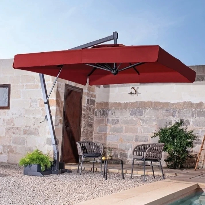A functional and stylish choice offering superior shade. The side-arm Rimini sunshade is ideal for lounge areas, poolside zones, or beach bars. Its metal frame is available in white or anthracite, and the canopy can be ordered with or without a decorative pendant. The cover is salt- and UV-resistant, while the included base pots ensure excellent stability.