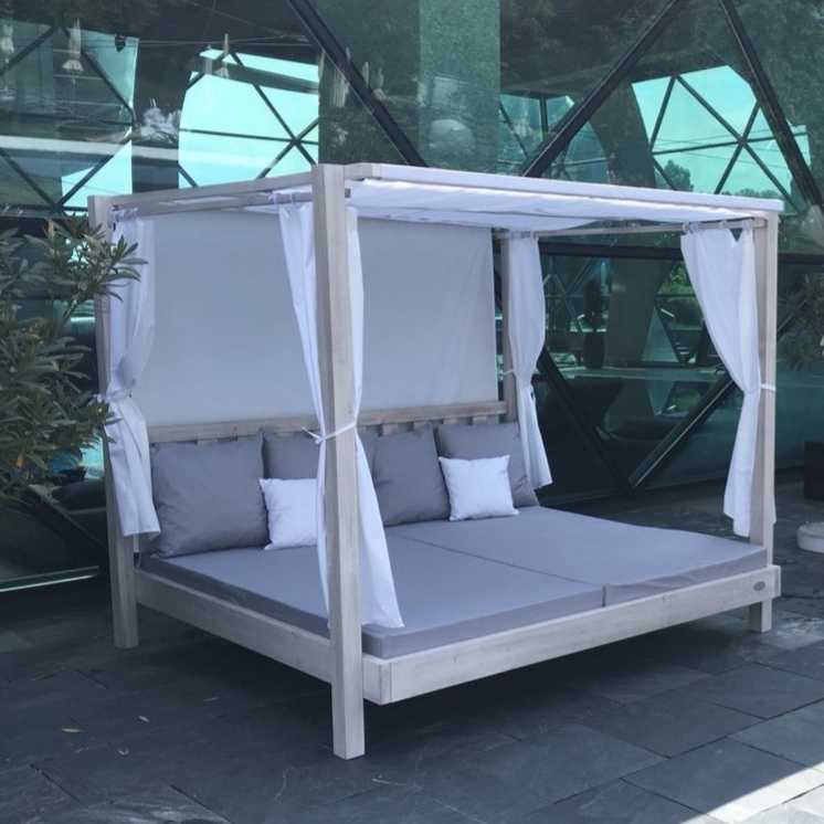 Luxury meets natural beauty in this elegant beach canopy bed. Perfect for high-end resorts, private wellness zones, and stylish beach clubs. The robust pine wood structure supports a spacious mattress with salt- and UV-resistant fabric. The set includes curtains, mattress, two pillowcases, and four decorative pillows – all in customizable colors.